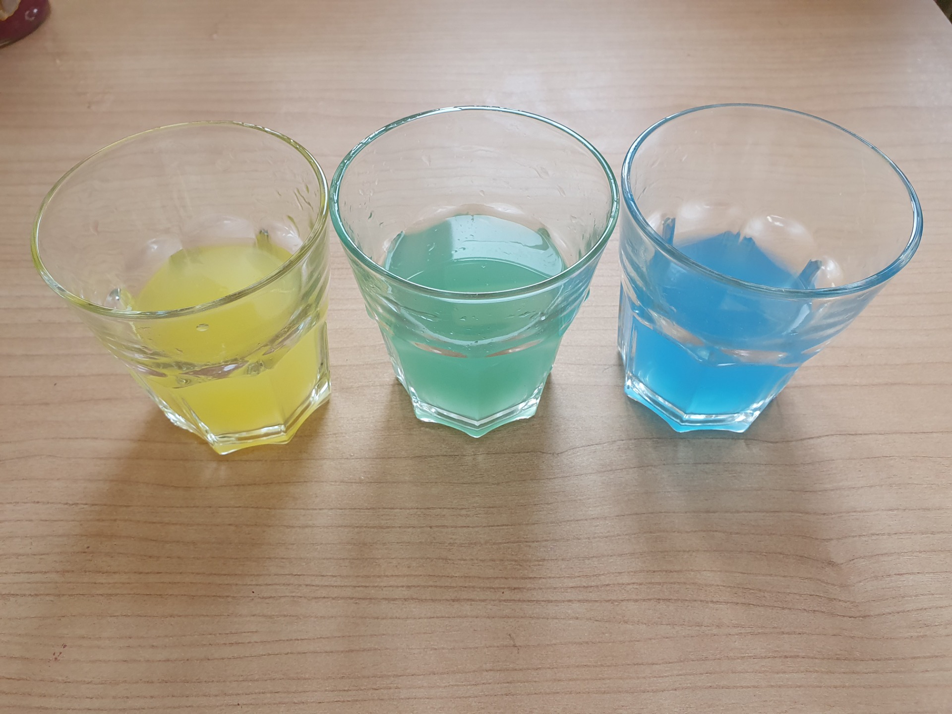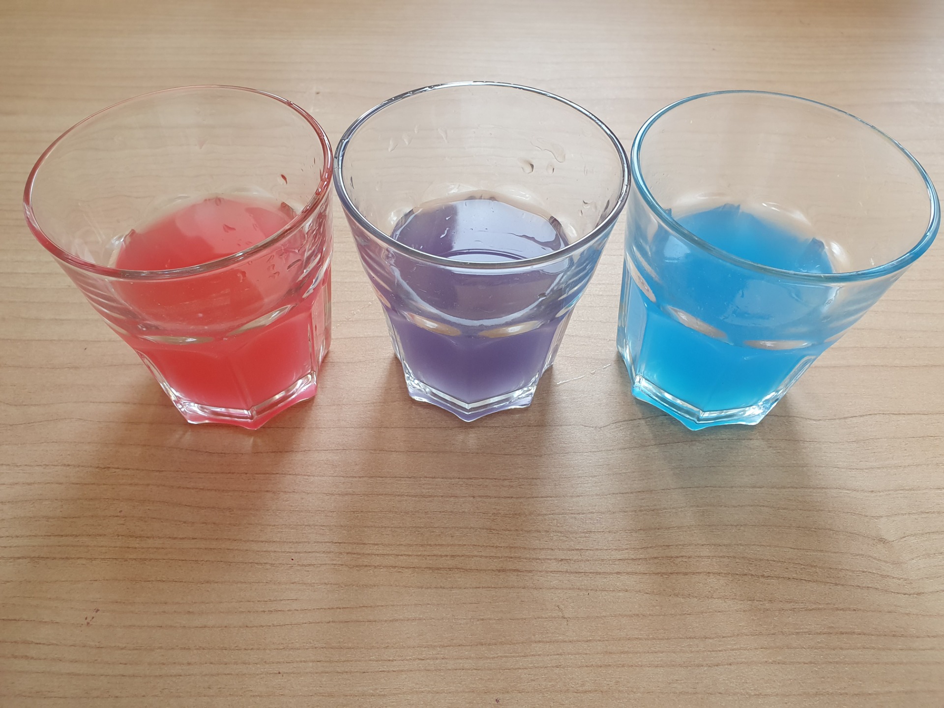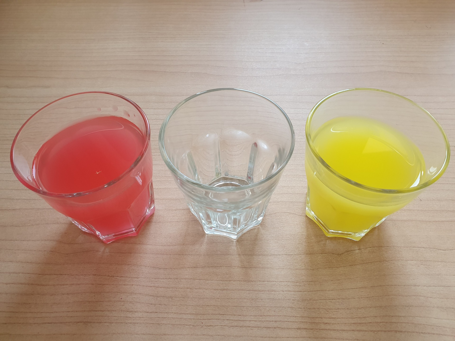 Cominciamo subito disponendo i tre bicchieri uno accanto all'altro. Riempiamo con un po' d'acqua i due bicchieri all'estremità e sciogliamo all'interno di essi un colore primario. Il bicchiere in mezzo deve rimanere vuoto! Attenzione! Il livello dell'acqua nei due bicchieri deve essere uguale.