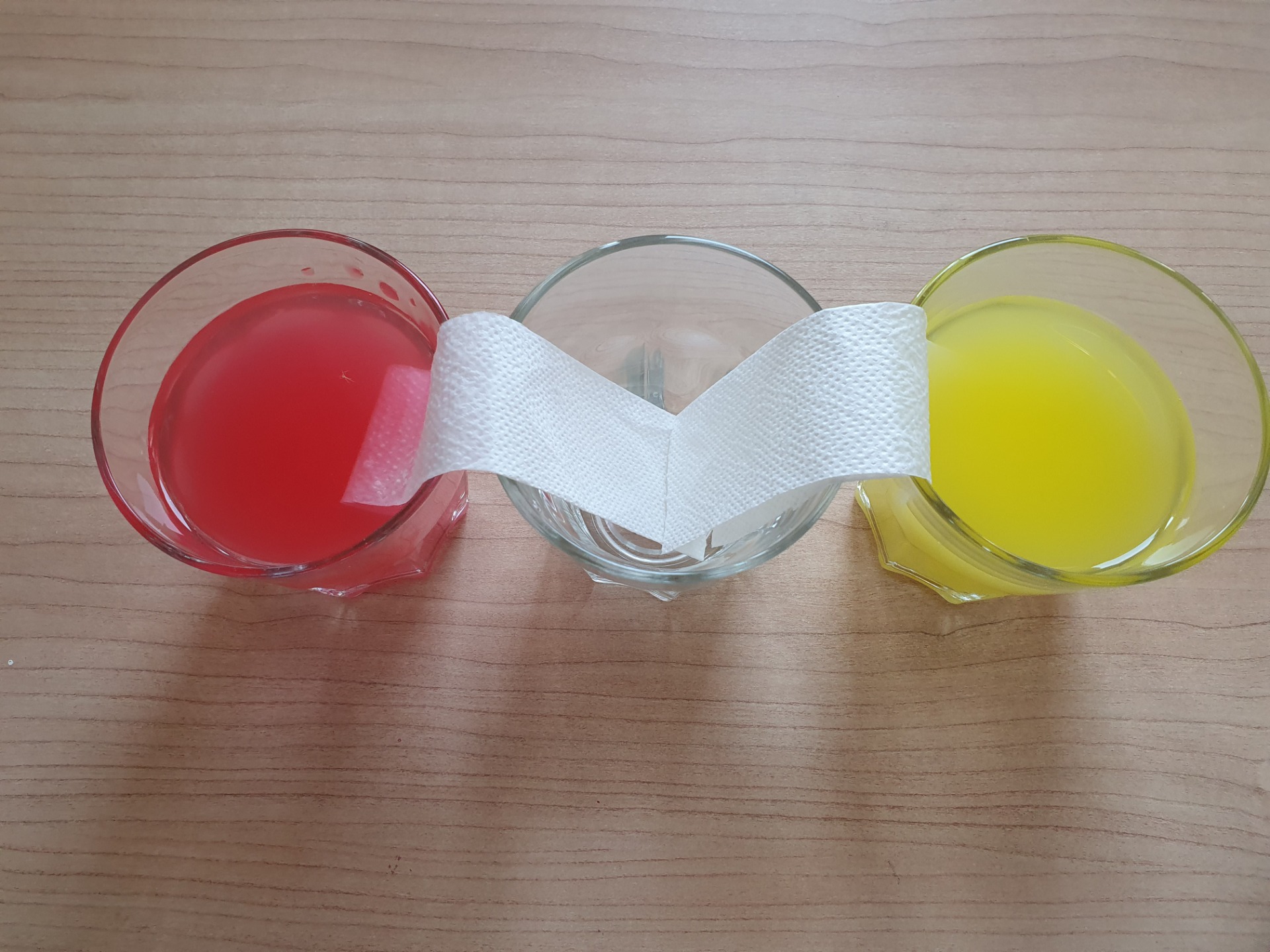 Prendiamo poi le due striscioline di scottex e mettiamo la prima a cavallo tra il primo e il secondo bicchiere e la seconda tra il secondo e il terzo: come per formare due ponti.