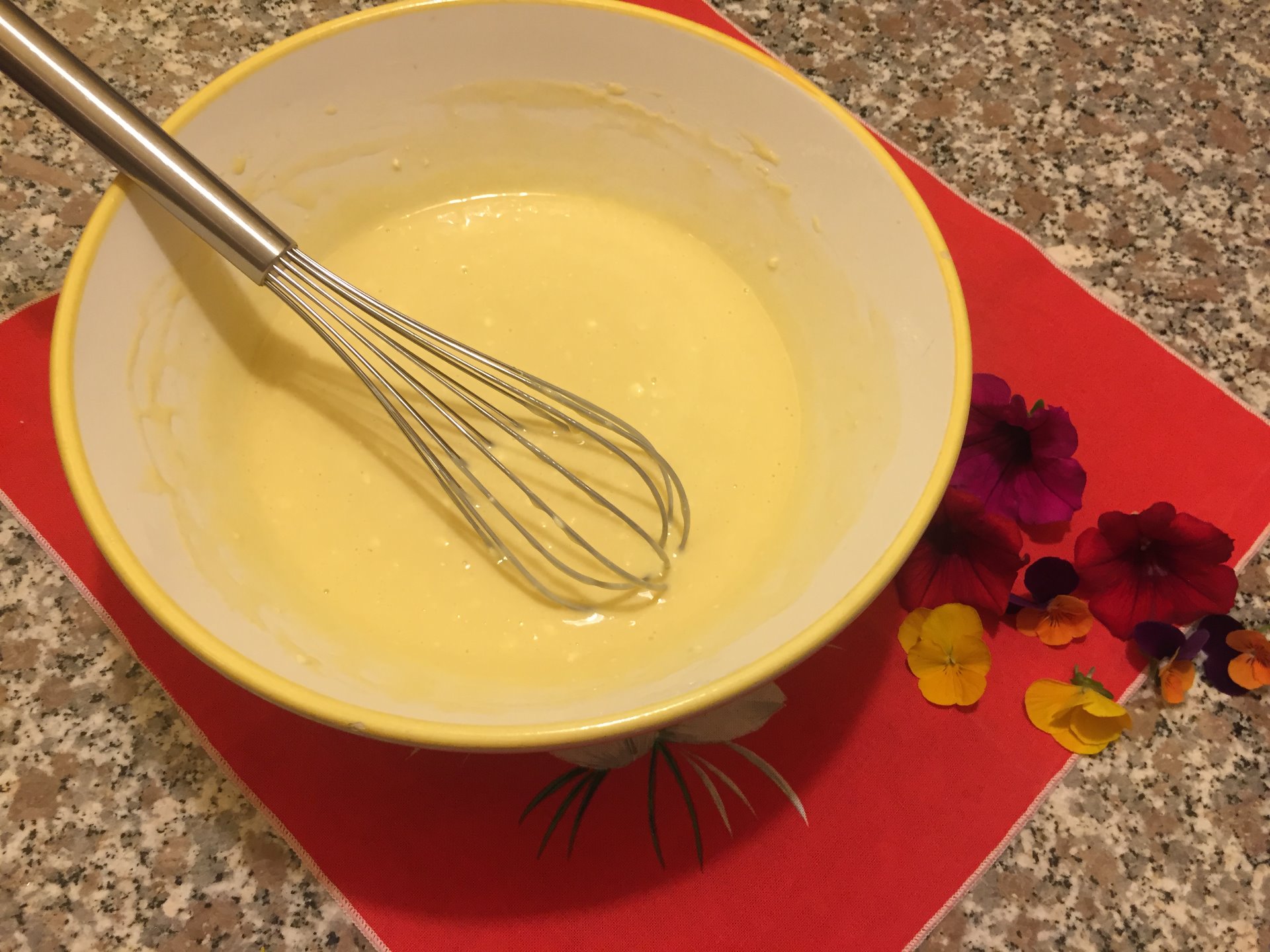 in una ciotola versate la farina, lo zucchero, il lievito e il pizzico di sale, e mescolate il tutto con una frusta. Successivamente, in un'altra ciotola, rompete le uova e unitevi il latte e il burro; quindi, mescolate il tutto affinché gli ingredienti si amalgamino.